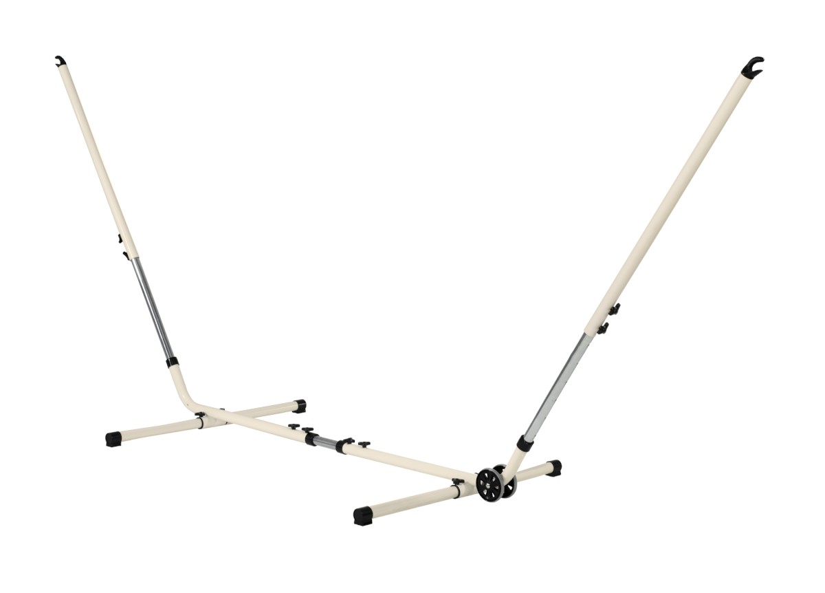 Hengekøyestativ i metall for hengekøyer opptil en totallengde på 350 cm når hengekøyen er med trestenger. Testet pulverlakkert stativ for en maksimal belastning på 120 kg. Hengekøyestativ som er justerbart. Superfint stativ for 1- og 2-persons hengekøyer.