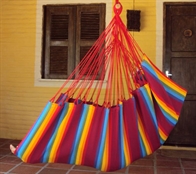 Stoff hengekøyestol til institusjonsbruk og vill lek på hjemmefronten. Sterkt stoff, sterke sømmer, sterkt materiale produsert i 100% bomull, ganske enkelt lekker og mega romslig og stor hengekøyestol. Stoffareal 1,3 x 2,10 m. Bemerk den ekstra lengden og bredden. Treverk FSC godkjent, sertifisert. Særklasse hengestol for dem som vil ha det ultimate.