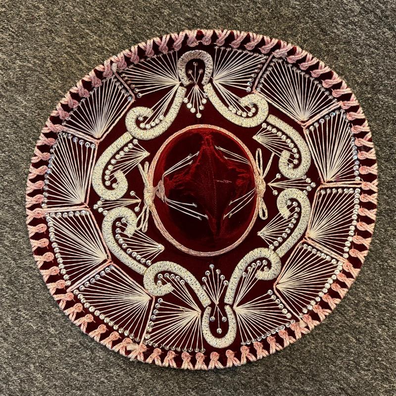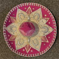 Flott og spesiell pynt til veggen. Unik hatt for samlere. Diameter 59 cm, produsert av filt på utstanset pappmaler. Gull og sølvfarget tråder skaper mønstrene i hatten.