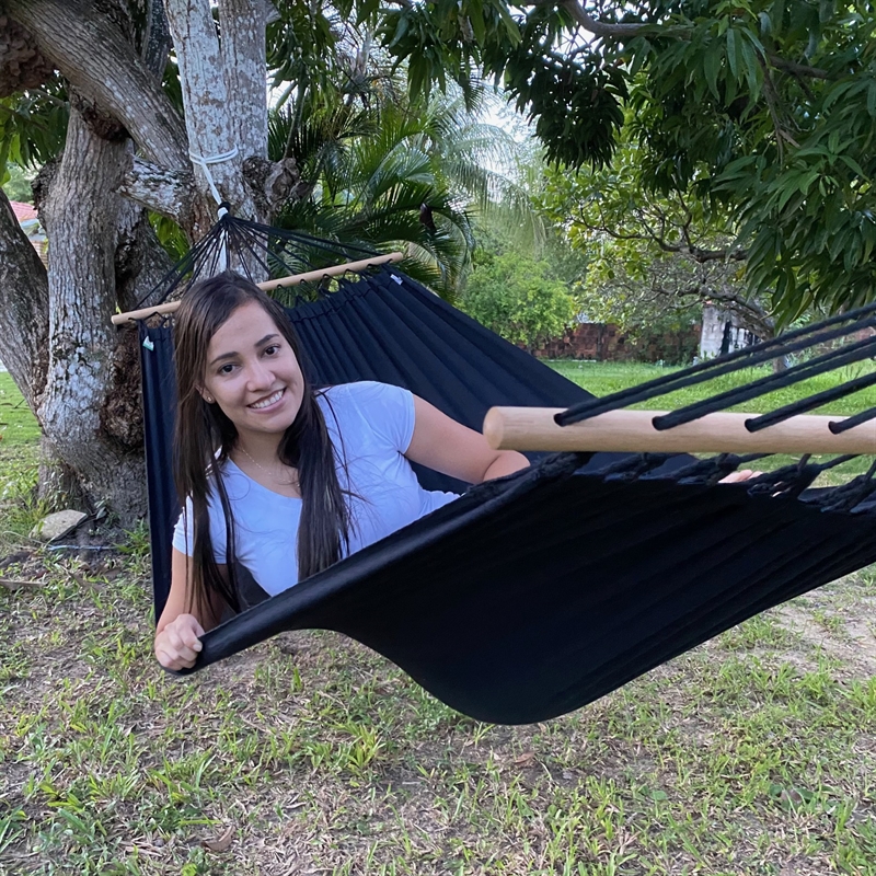 Sort hengekøye i stoff med 80 cm bred rundstokk.